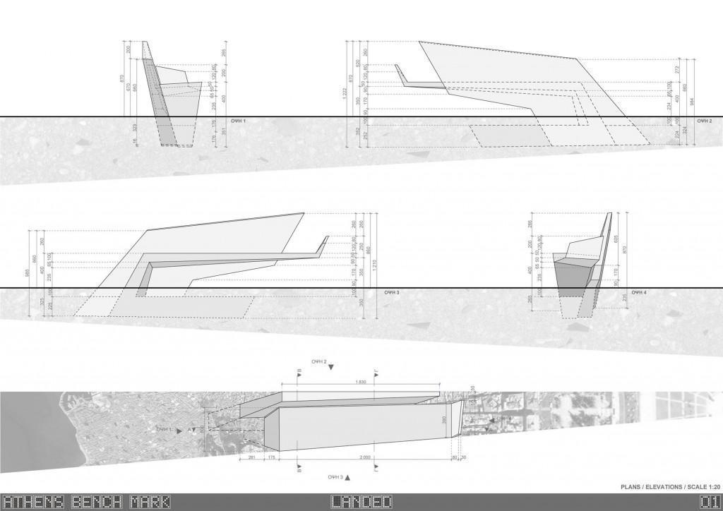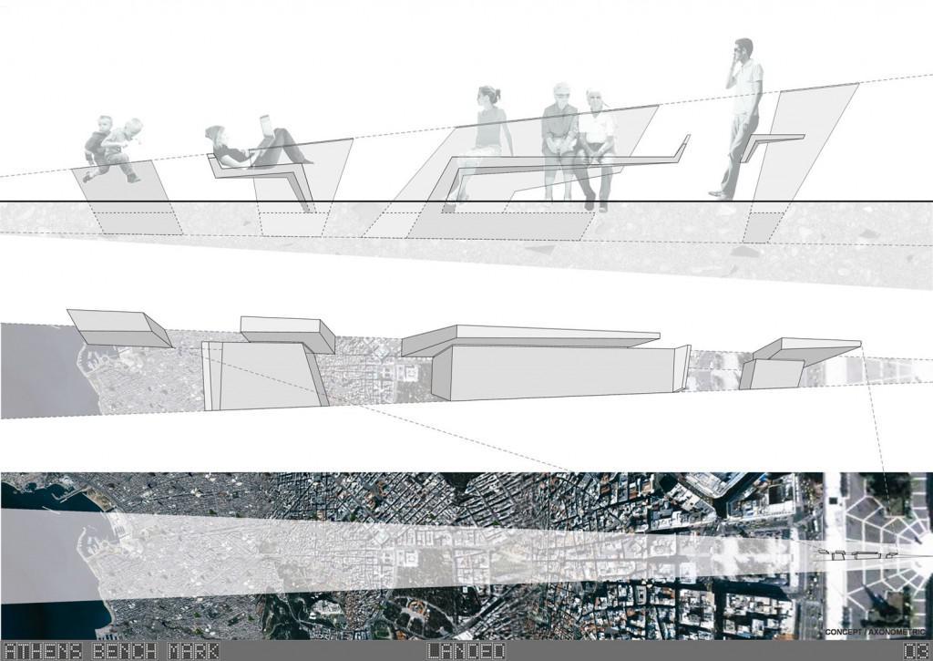 “LANDED” Πηγή έμπνευσης Η προσομοίωση της σταδιακής μεταβολής της κλίμακας μιας πόλης, όπως την αντιλαμβανόμαστε κατά την προσγείωση, με την προοπτική της σύνθεσης που οδηγεί στο ίδιο σημείο φυγής, συνδέει δυναμικά την πολεοδομική κλίμακα με τη μικροκλίμακα του αντικειμένου. Η φόρμα περιλαμβάνει μία πλευρά στατική, που πηγάζει από τη σχέση της με το έδαφος, ενώ ταυτόχρονα βρίσκεται σε διάλογο με τον αβαρή-αεροδυναμικό της χαρακτήρα. Η χρήση σκυροδέματος με εμφανή αδρανή εικονίζει την ανακύκλωση μέσα από την επανάχρηση των υλικών, ενώ παράλληλα δανείζεται την υφή της θέας μιας πόλης από ψηλά, όπου τα κτίρια εμφανίζονται σαν κουκκίδες. Εδώ παρουσιάζεται μια ομάδα από γλυπτά-καθίσματα, τα οποία μπορούν να τοποθετηθούν είτε ως σύνολο είτε μεμονωμένα.
