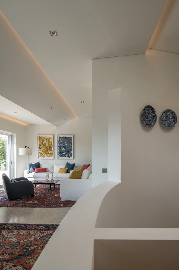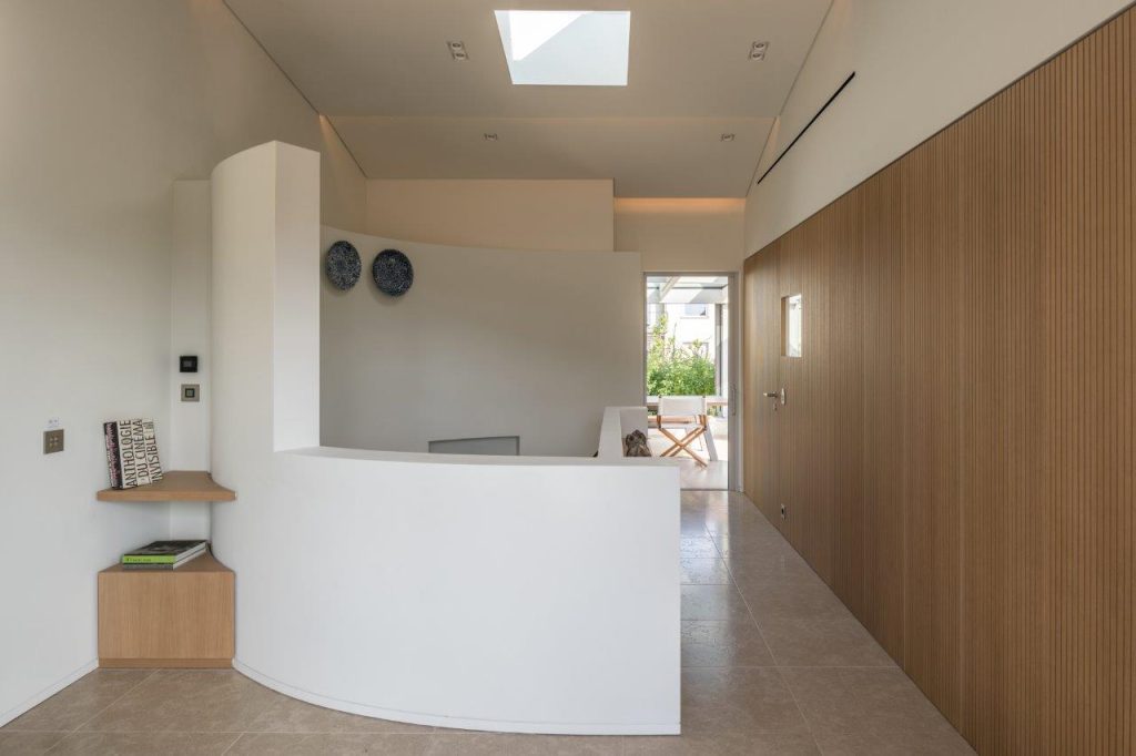 Οι συγκεκριμένες πτυχώσεις της στέγης γίνονται αντιληπτές και στο εσωτερικό του κτιρίου, όπου δημιουργούν μια ιδιαίτερα ενδιαφέρουσα οροφή. Η πέτρα που χρησιμοποιήθηκε για όλα τα δάπεδα των βεραντών συνεχίζει και στο μεγαλύτερο μέρος των εσωτερικών δαπέδων. Έτσι ενοποιούνται οι εξωτερικοί με τους εσωτερικούς χώρους και διευκολύνεται η μετάβαση μεταξύ τους. “Η δημιουργία ενός όσο το δυνατόν αποτελεσματικότερου ενεργειακού κτιρίου ήταν πρόκληση για τη μελετητική και κατασκευαστική ομάδα αλλά και για τον ιδιοκτήτη” καταλήγει ο Θοδωρής Ζουμπουλάκης.