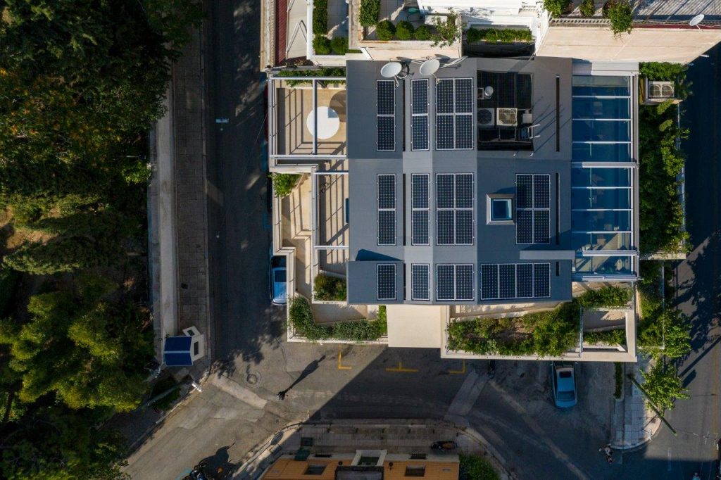Η σημαντικότερη επέμβαση στο εξωτερικό είναι η προσθήκη της ιδιαίτερης μεταλλικής στέγης. Στην επιφάνεια της τοποθετήθηκαν στη συνέχεια τα ηλιακά πετάσματα που επιτυγχάνουν την ενεργειακή αναβάθμιση της κατοικίας. Σε αυτό το πλαίσιο δημιουργήθηκαν επιπλέον φυτεμένα δώματα ώστε να ενταχθεί το πράσινο στη μέγιστη δυνατή επιφάνεια. Η έντονα γεωμετρική, γλυπτική θα μπορούσε να πει κανείς, μορφή της στέγης έχει έναν χαρακτήρα σύγχρονης αρχιτεκτονικής παρέμβασης. Με τον τρόπο αυτό το έργο εντάσσεται ακόμα καλύτερα στο αστικό τοπίο που το περιβάλλει. Εντυπωσιακές οι πτυχώσεις της στέγης οι οποίες εκφράζουν την προσπάθεια να προσαρμοστεί στις διάφορες κλίσεις του ήλιου κατά τη διάρκεια της ημέρας. Στόχος είναι να επιτευχθεί η μέγιστη απορρόφηση ενέργειας από τα φωτοβολταϊκά.