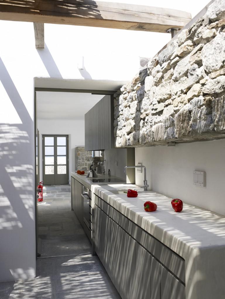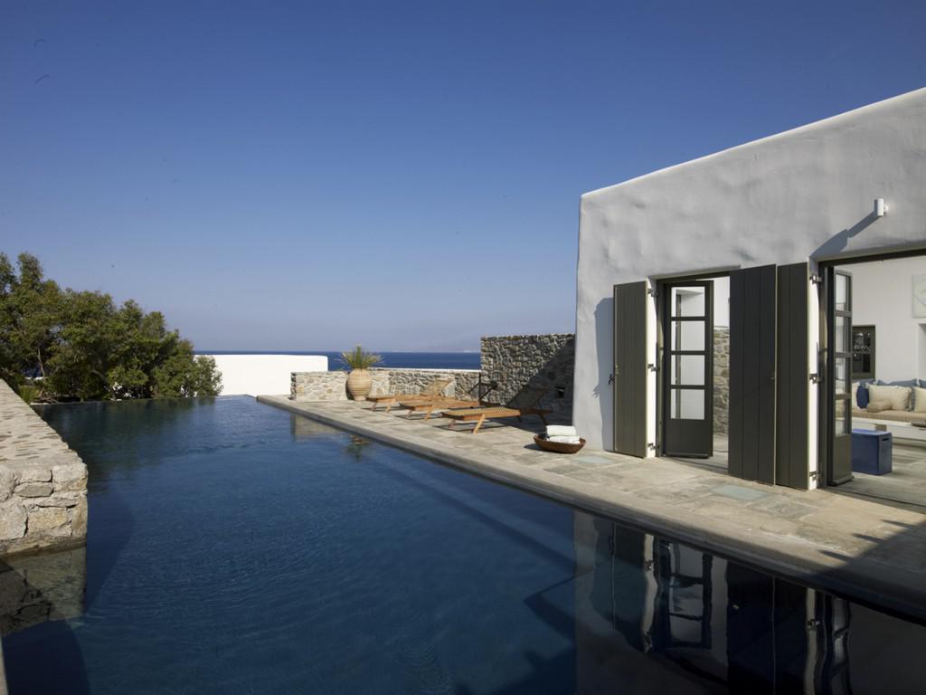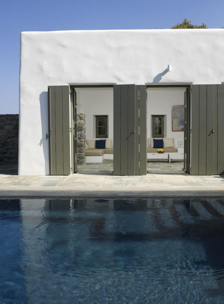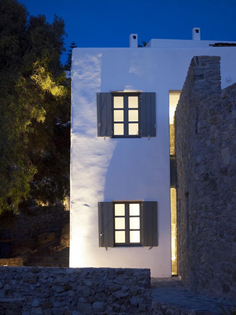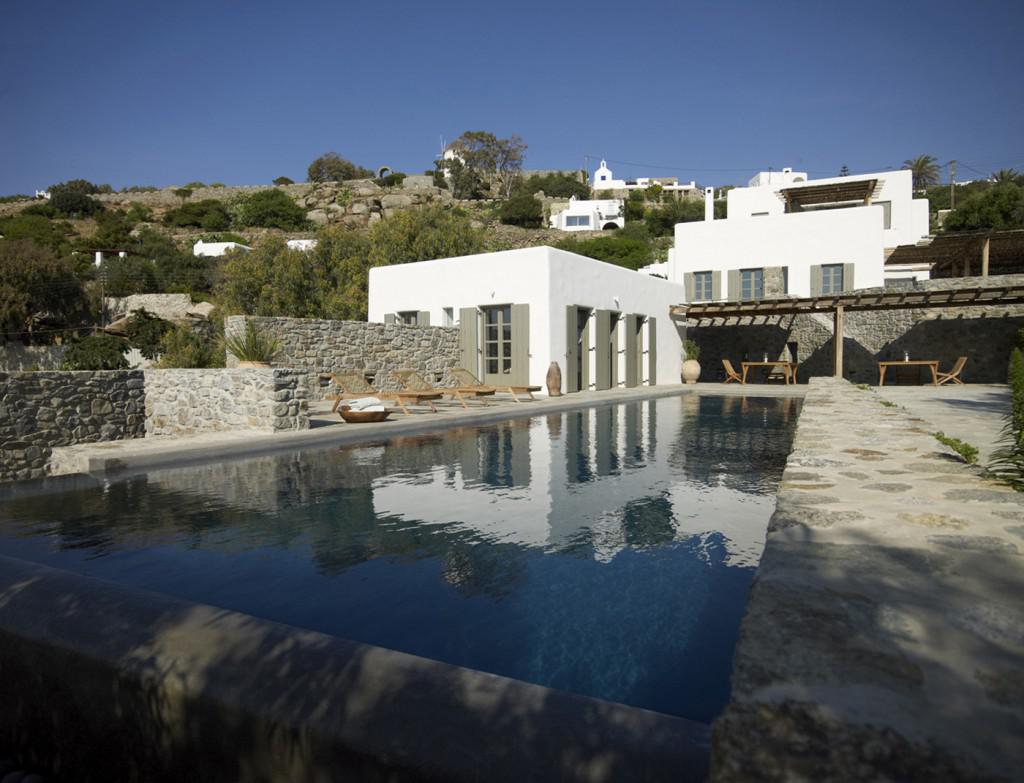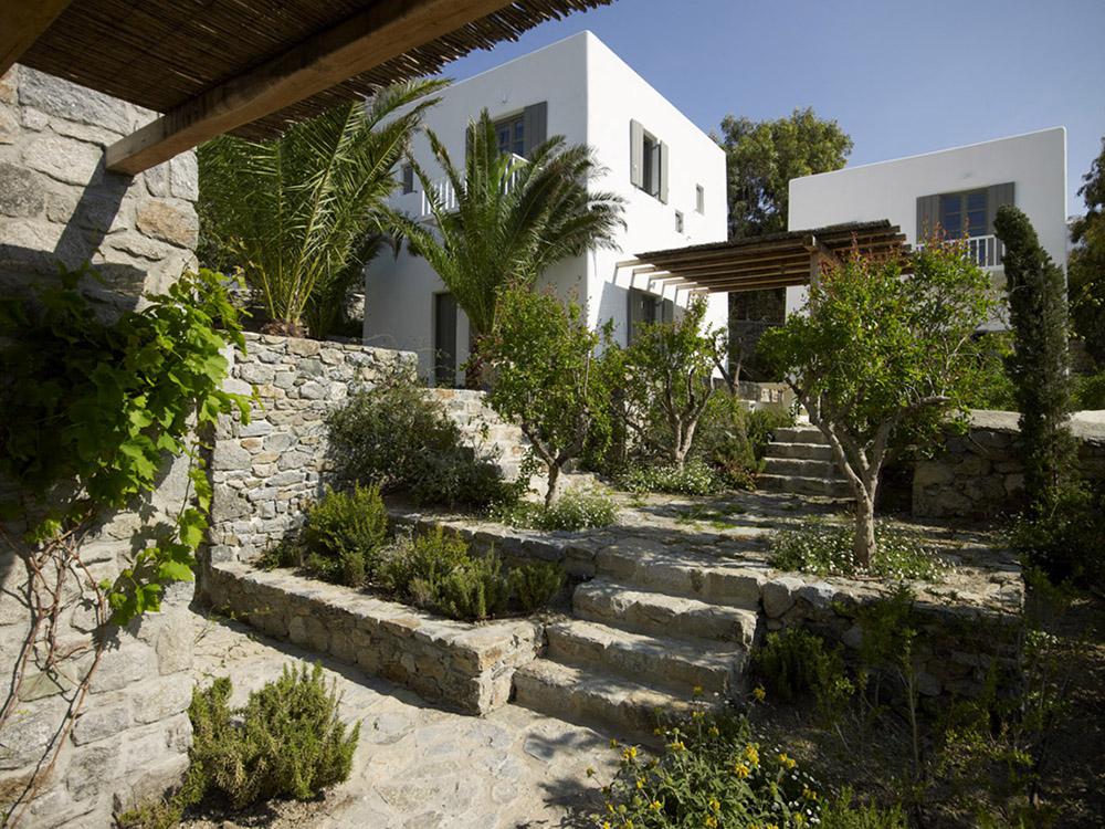 Η κατοικία αποτελείται από έξι ανεξάρτητα κτίρια, που εντάσσονται αρμονικά στο ανάγλυφο του φυσικού εδάφους. Βασικούς άξονες της μελέτης αποτέλεσαν η διατήρηση των υπαρχόντων στοιχείων του τοπίου, όπως οι ξερολιθιές που διέσχιζαν το παλιό οικόπεδο και οι βραχόκηποι, η αντιμετώπιση της δύσκολης μορφολογίας του εδάφους και του γνωστού δυνατού βοριά, καθώς και η εφαρμογή του κτιριολογικού προγράμματος.