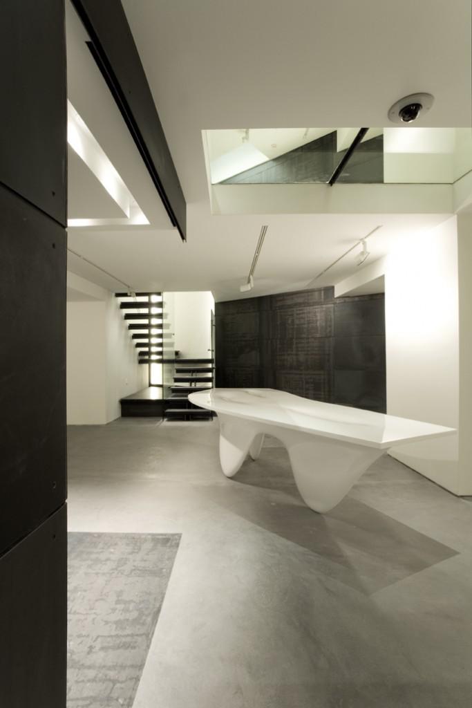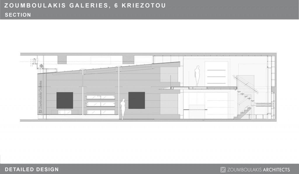 Ο χώρος της Γκαλερί Ζουμπουλάκη συντίθεται από τη λευκή επιφάνεια του περιβλήματος και από μια τρισδιάστατη μεταλλική κατασκευή που ξεδιπλώνεται μέσα σε αυτό. Στο μεταξύ τους κενό έχει τοποθετηθεί ο κρυφός φωτισμός. Τα μεταλλικά φύλλα από φυσικό σίδερο δημιουργούν εσοχές, σχισμές και ορίζουν τις επιφάνειες έκθεσης. Ο μηχανολογικός εξοπλισμός έχει ενταχθεί απόλυτα στο χώρο.