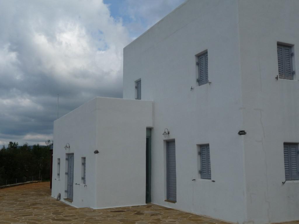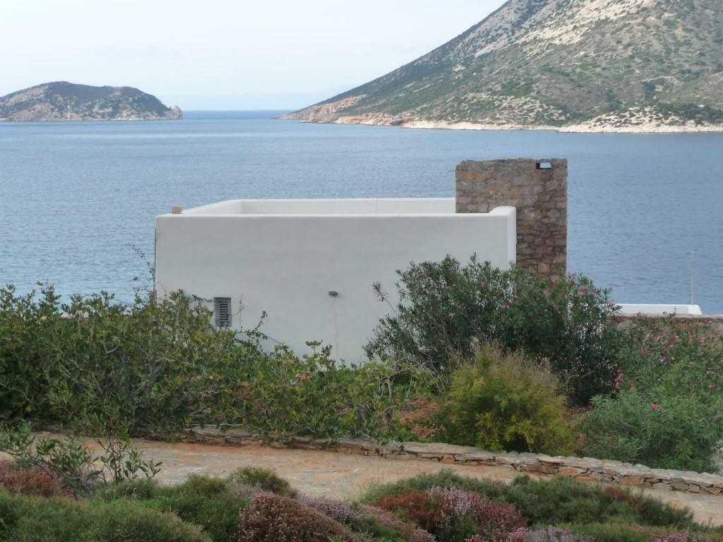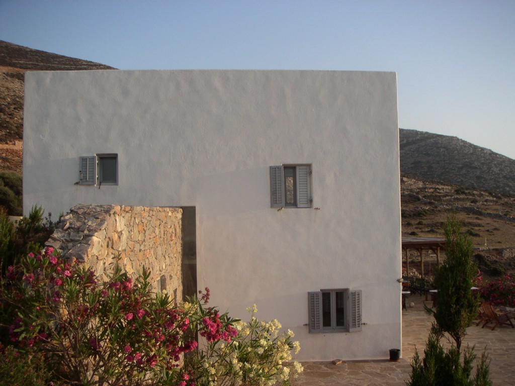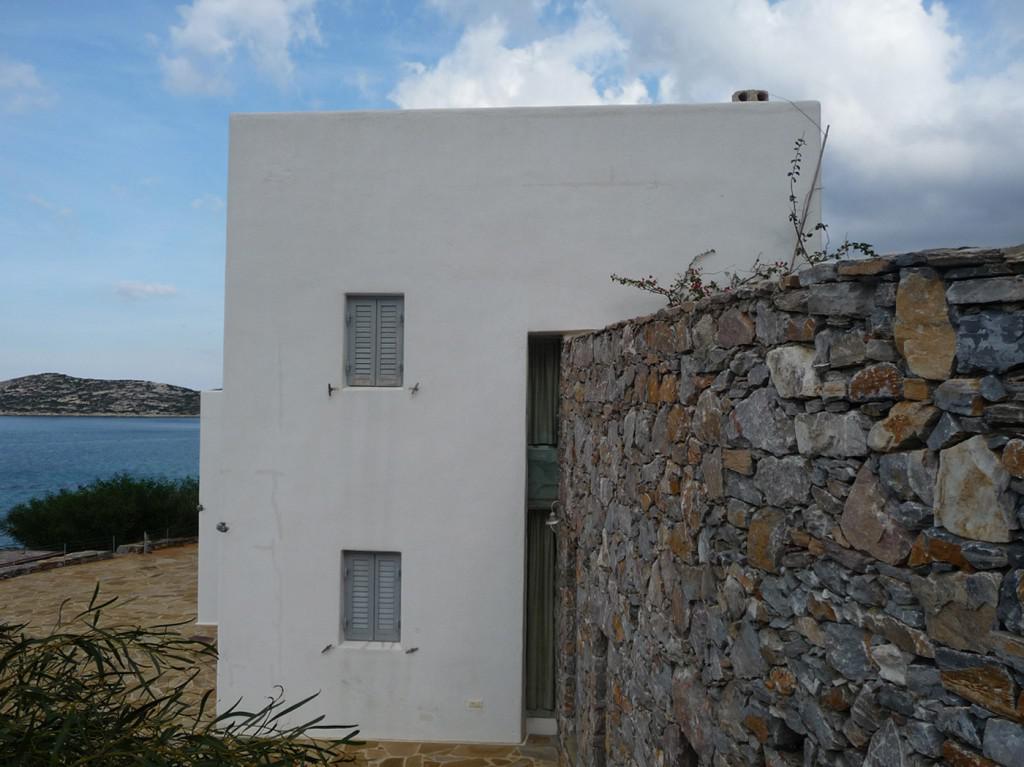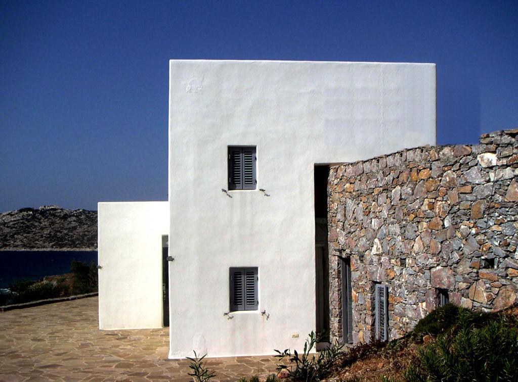 L’emplacement des maisons a été défini par les murets incurvés de pierres sèches, deux d’entre-deux ont été intègres à l’ensemble de ces bâtiments cycladiques. Les grandes ouvertures verticales du mur extérieur des bâtiments permettent une percée et une diffusion dans les volumes intérieurs de la lumière du soleil levant et du soleil couchant.