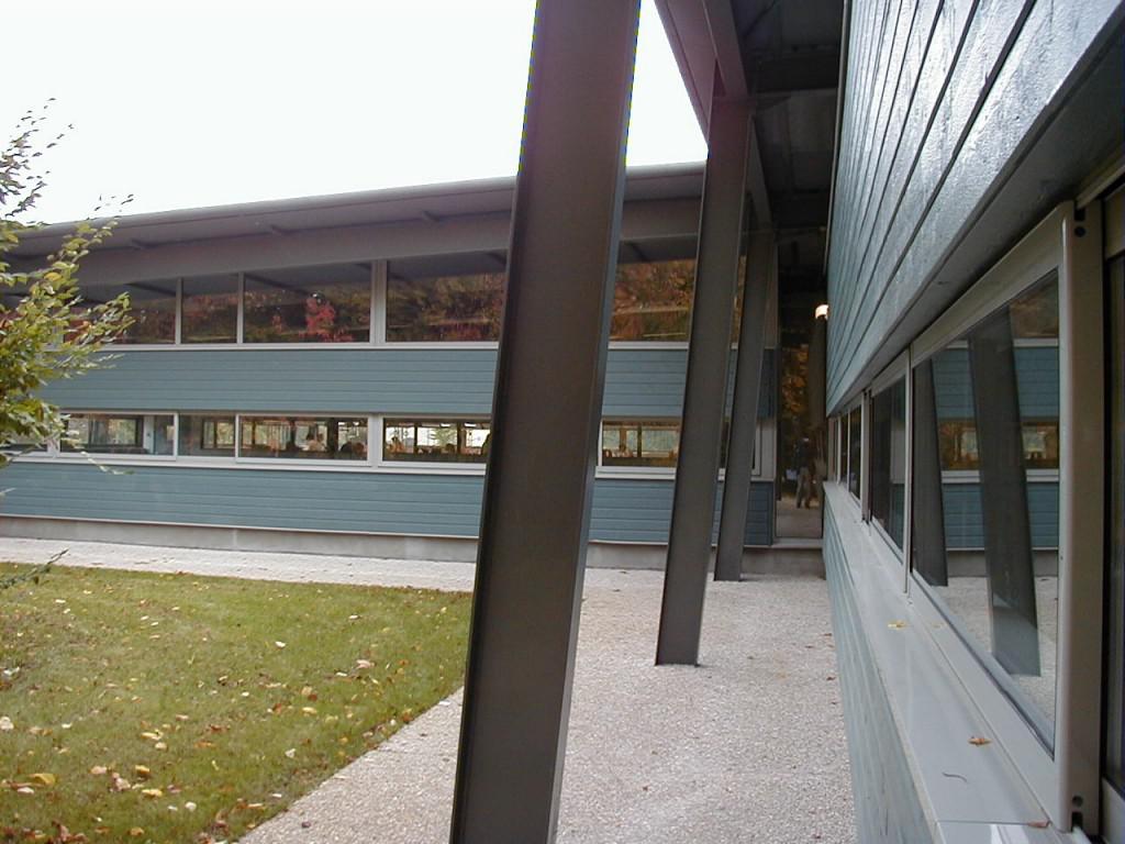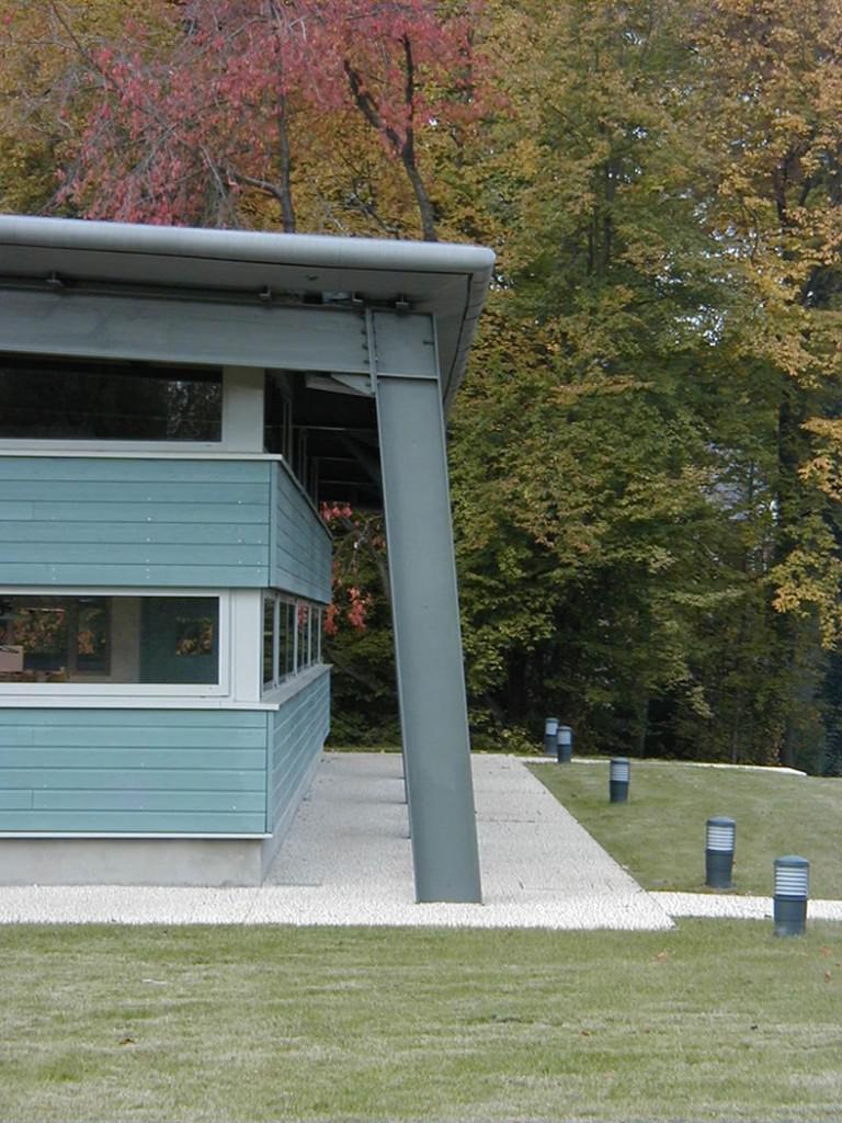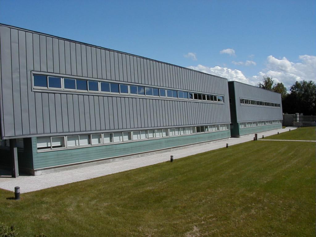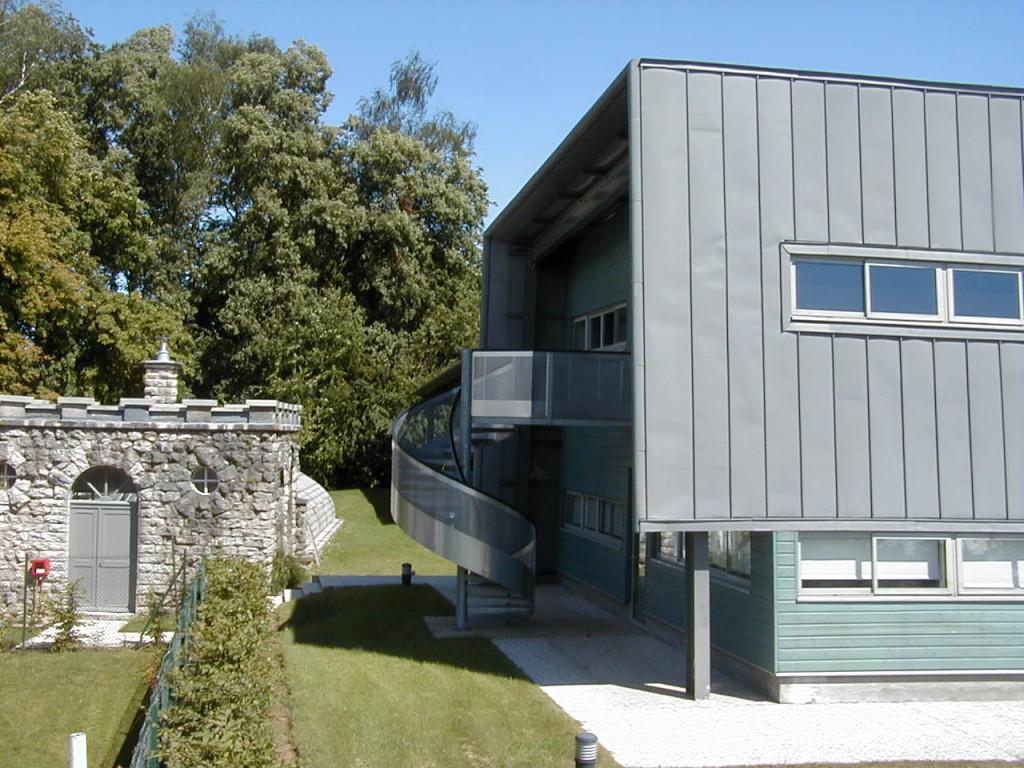 The building evolves around a gigantic folded metallic zinc-coated surface, which either forms the roof or penetrates the central masonry of the factory, disappearing into the earth and reappearing as part of the composition of the facade. The metal structure, as well as most of the mechanical equipment, is visible and designed in detail.